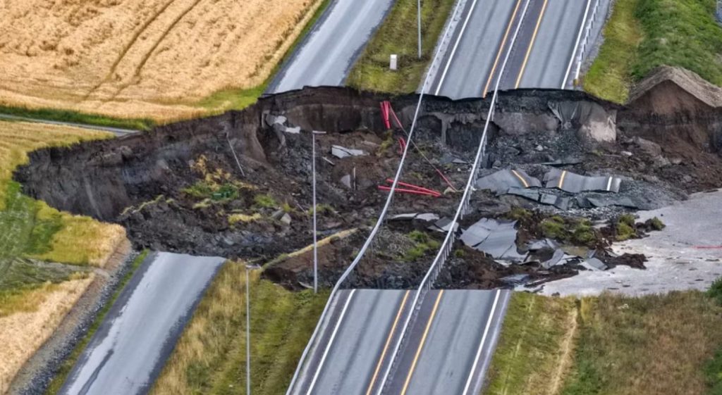 Μια μεγάλη τρύπα διασχίζει και τις δύο λωρίδες του αυτοκινητόδρομου E6 και τη σιδηροδρομική γραμμή στο Λεβανγιέρ, όπου σημειώθηκε η κατολίσθηση, δείχνουν φωτογραφίες που δημοσίευσαν νορβηγικά μέσα ενημέρωσης.