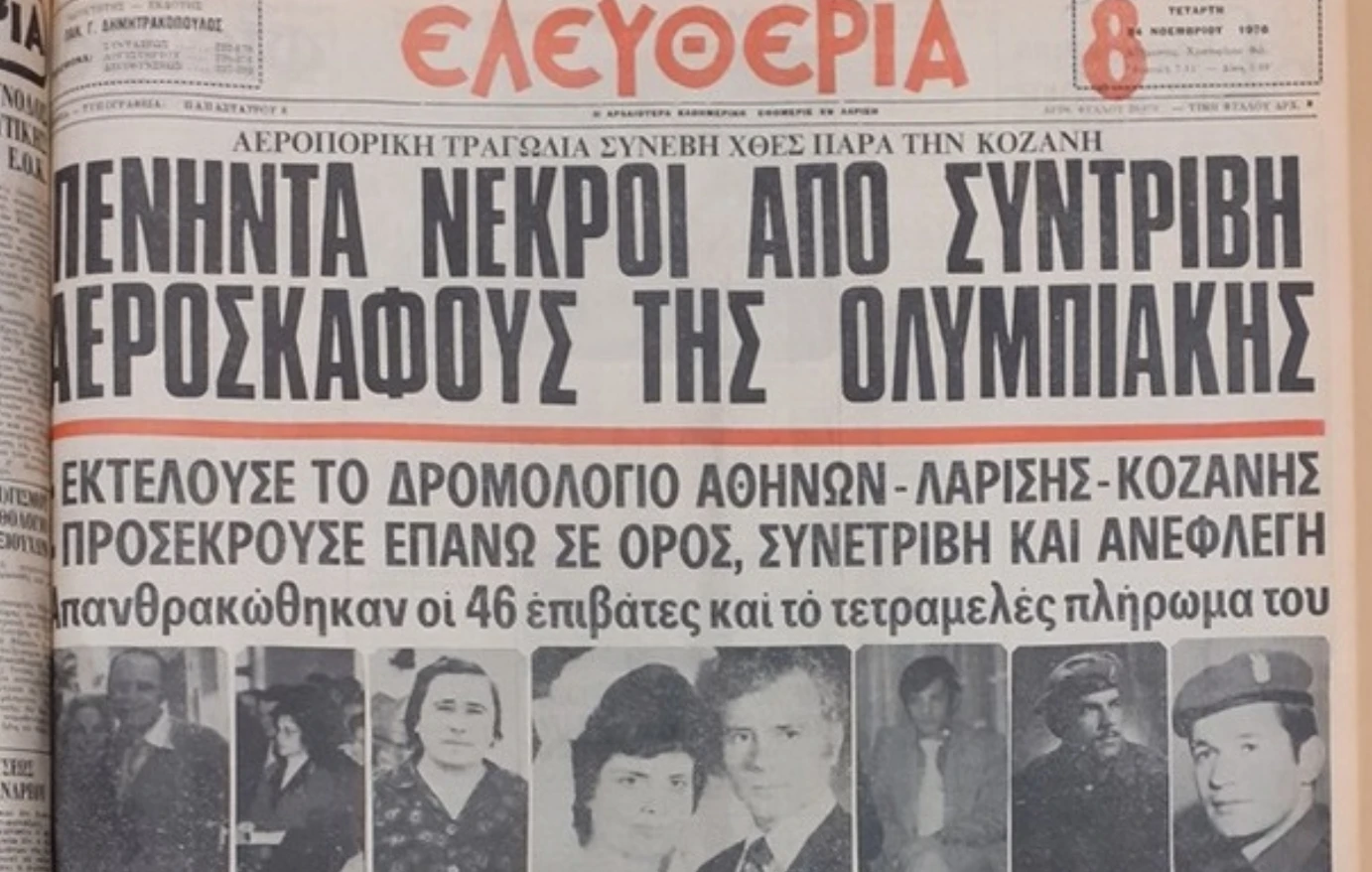 Στις 23 Νοεμβρίου 1976, η Ελλάδα έζησε μία από τις πιο τραγικές στιγμές της αεροπορικής της ιστορίας. Το ελικοφόρο αεροπλάνο της Ολυμπιακής Αεροπορίας τύπου YS-11A, με την ονομασία «Νήσος Μήλος», εκτελώντας το δρομολόγιο Αθήνα – Λάρισα – Κοζάνη, συνετρίβη στην περιοχή του Σαρανταπόρου κοντά στην Κοζάνη. Η τραγωδία κόστισε τη ζωή και στους 50 επιβαίνοντες, αφήνοντας πίσω της βαθιά οδύνη και αναπάντητα ερωτήματα.