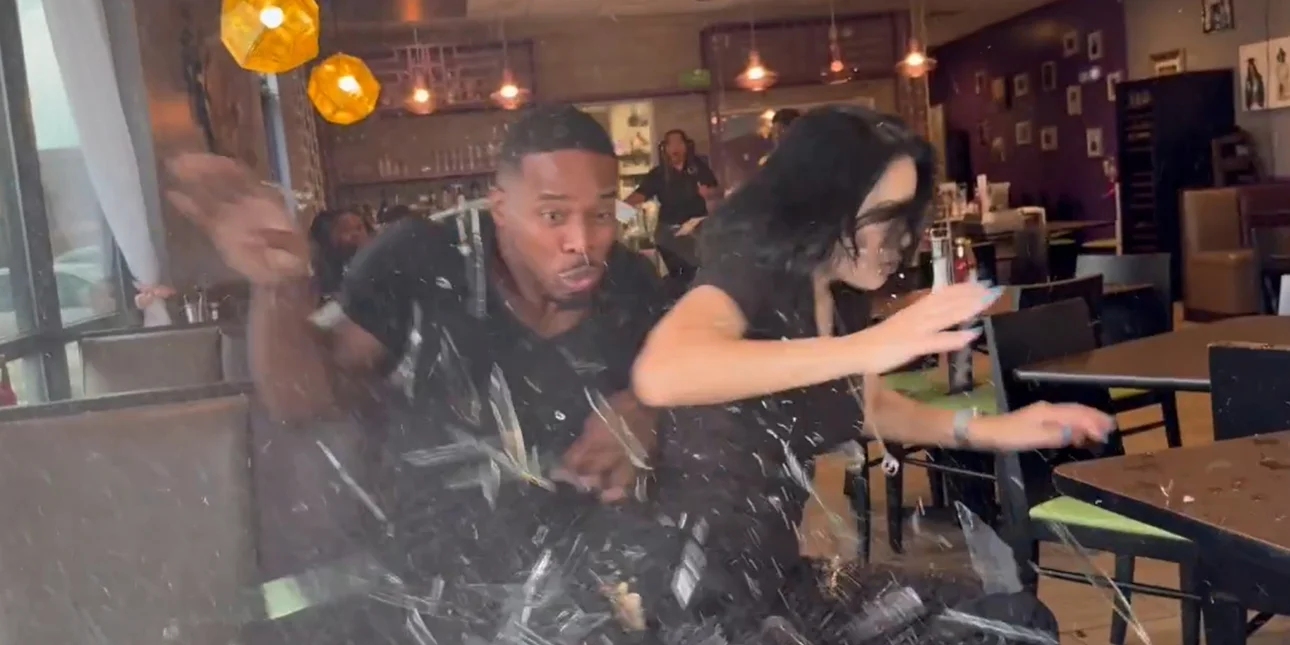 Στο viral βίντεο, το όχημα φαίνεται να εισβάλλει με φόρα στο εστιατόριο ακριβώς τη στιγμή που το ζευγάρι δοκιμάζει το burger του, αναποδογυρίζοντας το τραπέζι τους και ρίχνοντας τη Σαντιάγκο στο πάτωμα ενώ γυαλιά φαίνονται να πετάγονται παντού.