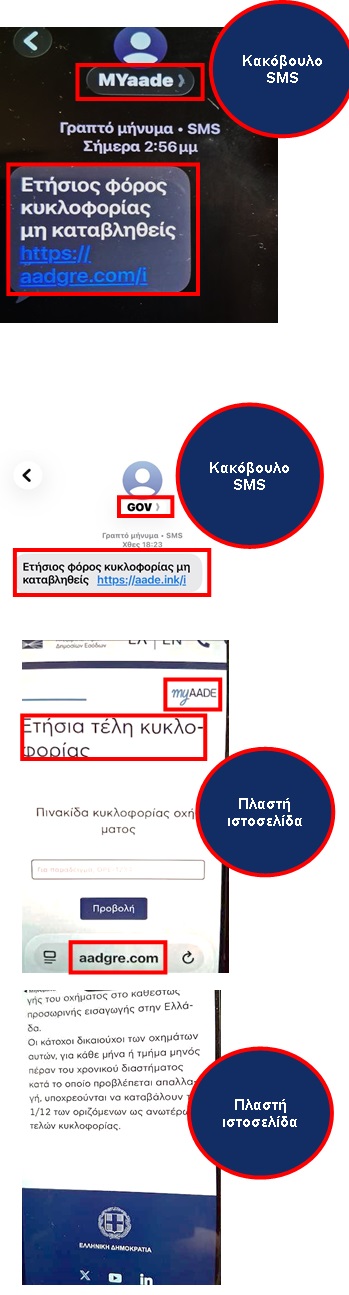 Τα μηνύματα αυτά, με την πρόφαση «μη καταβληθέντος ετήσιου φόρου κυκλοφορίας», ζητούν από τους παραλήπτες να πατήσουν σε σύνδεσμο (link) για να πληρώσουν δήθεν τέλη κυκλοφορίας οχημάτων.